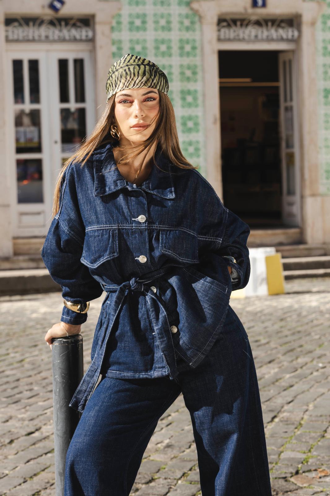 Casaco de ganga, com botões trabalhados de cima a baixo.