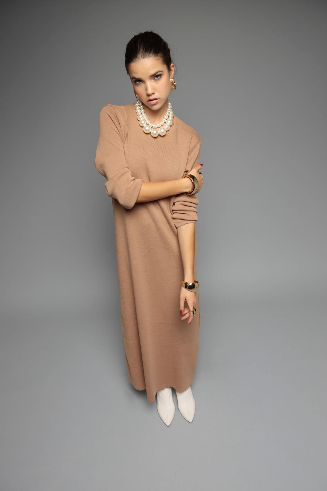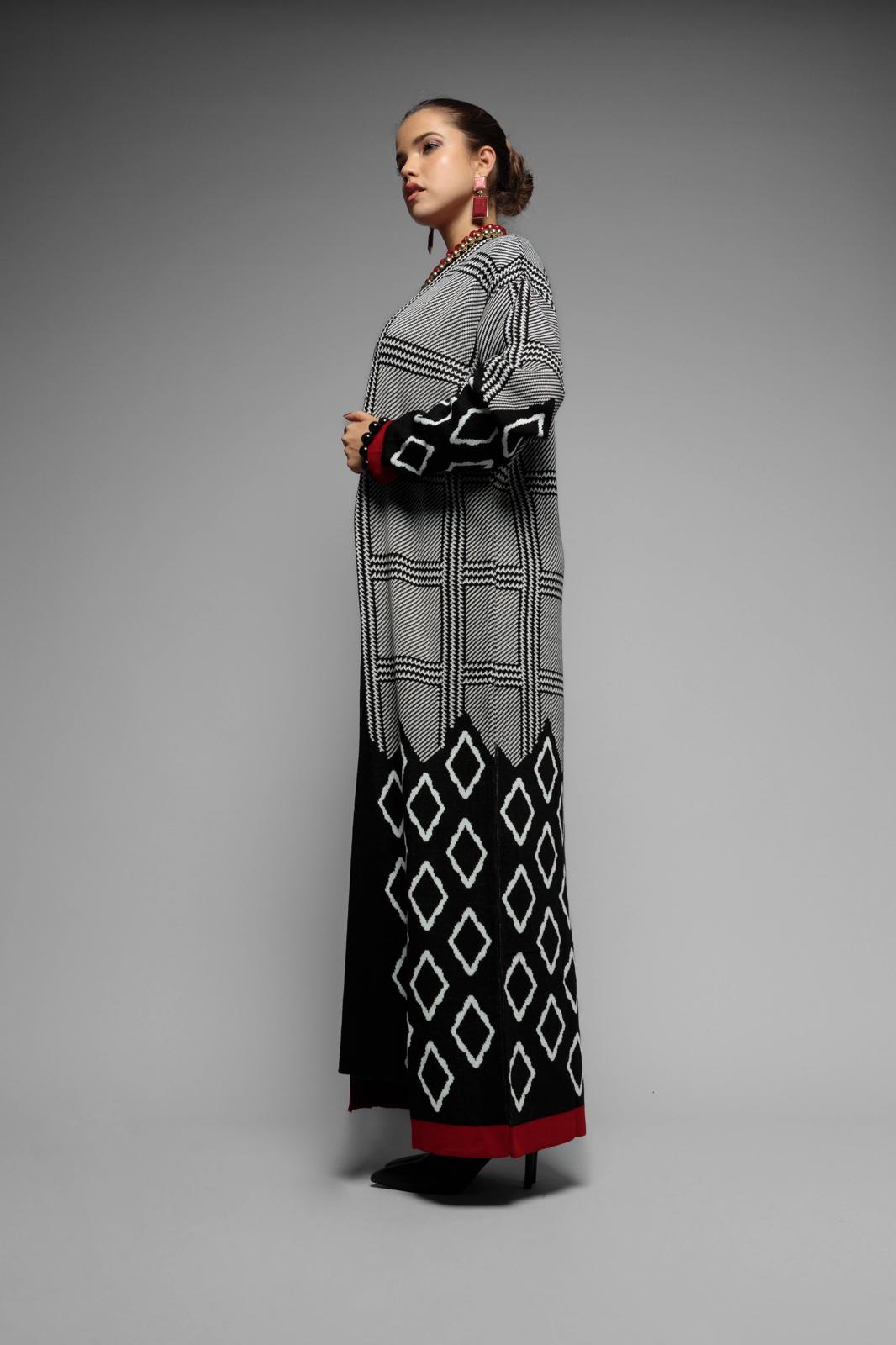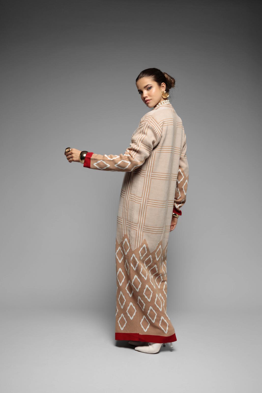 Vestido liso comprido, gola redonda e manga a terminar com punho. O casaco acompanha o tamanho do vestido. O casaco tem decote em v, sem botões.