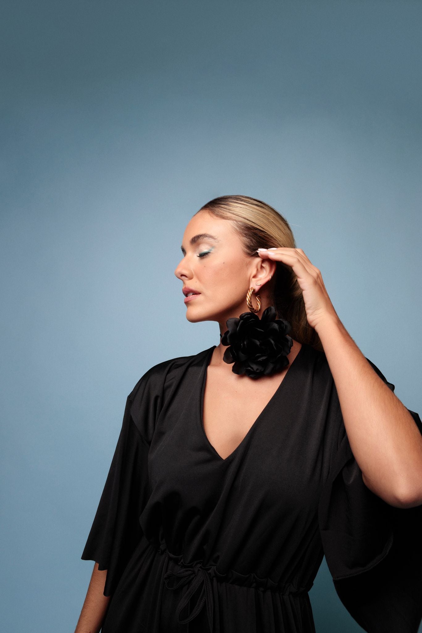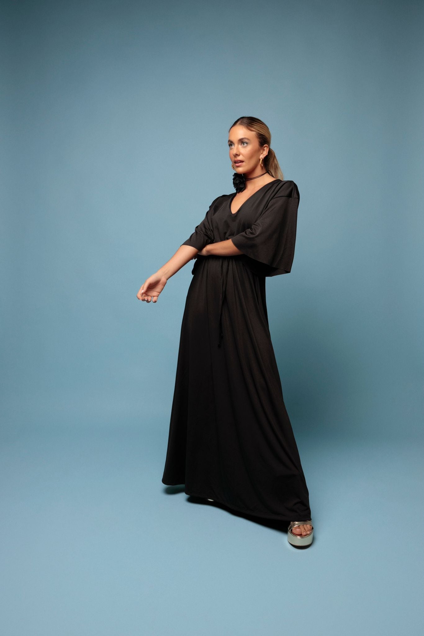 Vestido comprido em malha fria, decote em bico e manga curta. Saia solta e fluida, com elástico debaixo do peito que ajusta ao nosso tamanho. Veste até um tamanho XXL .