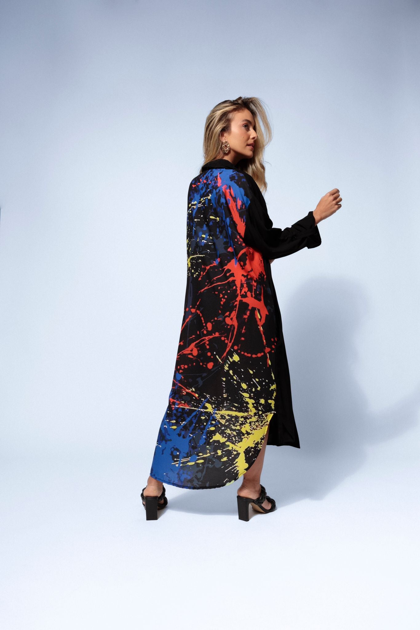 Vestido camiseiro com gola e sem punho no acabamento. Fecha à frente com botões. Parte da frente em tecido preto e parte de trás estampado (em tecido poliester). Veste até um tamanho XL .