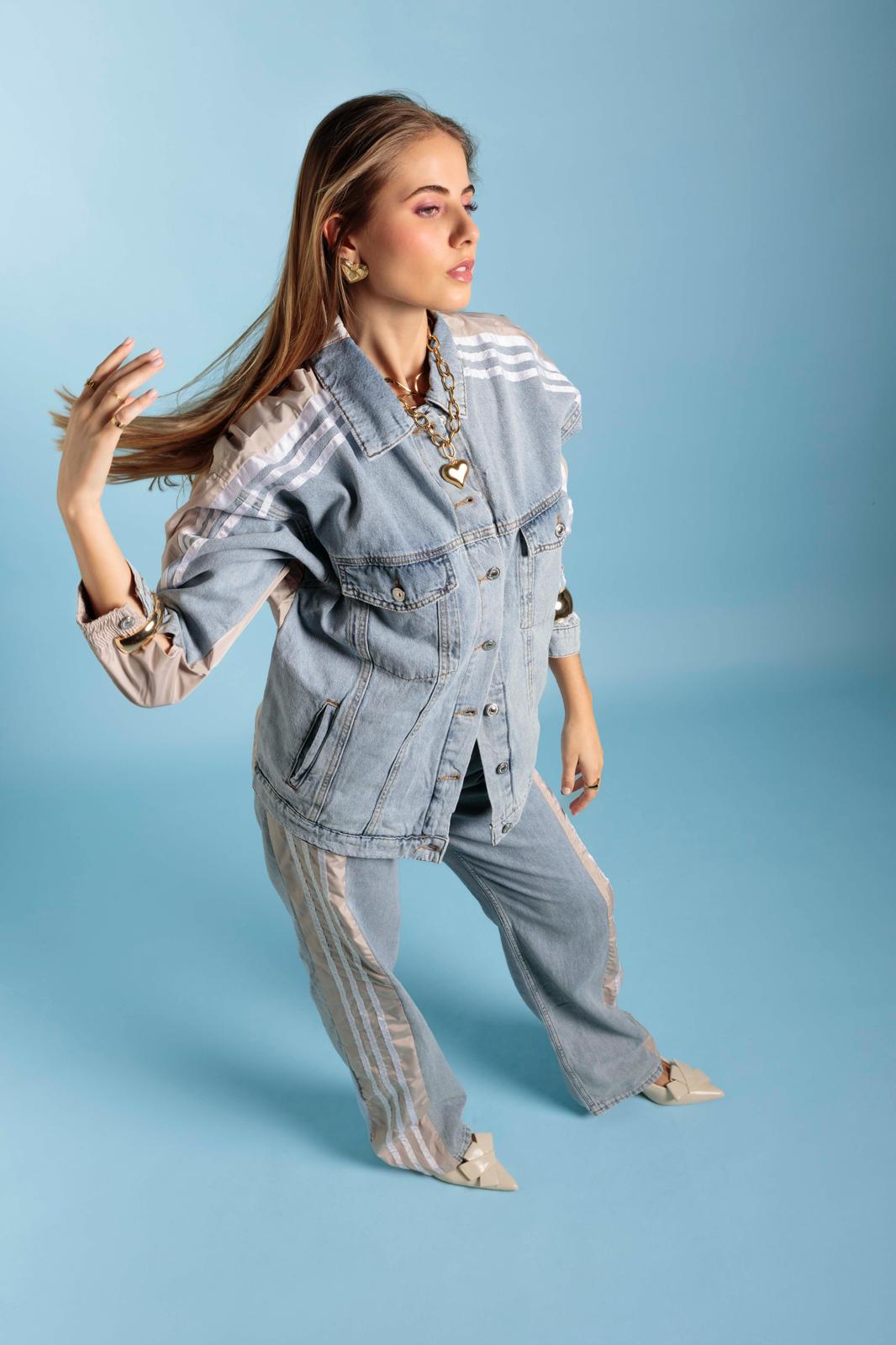 Blusão de ganga oversize. Parte da frente em tecido ganga. Costas tecido impermeável com 3 riscas brancas no braço.