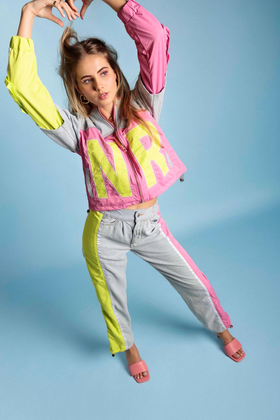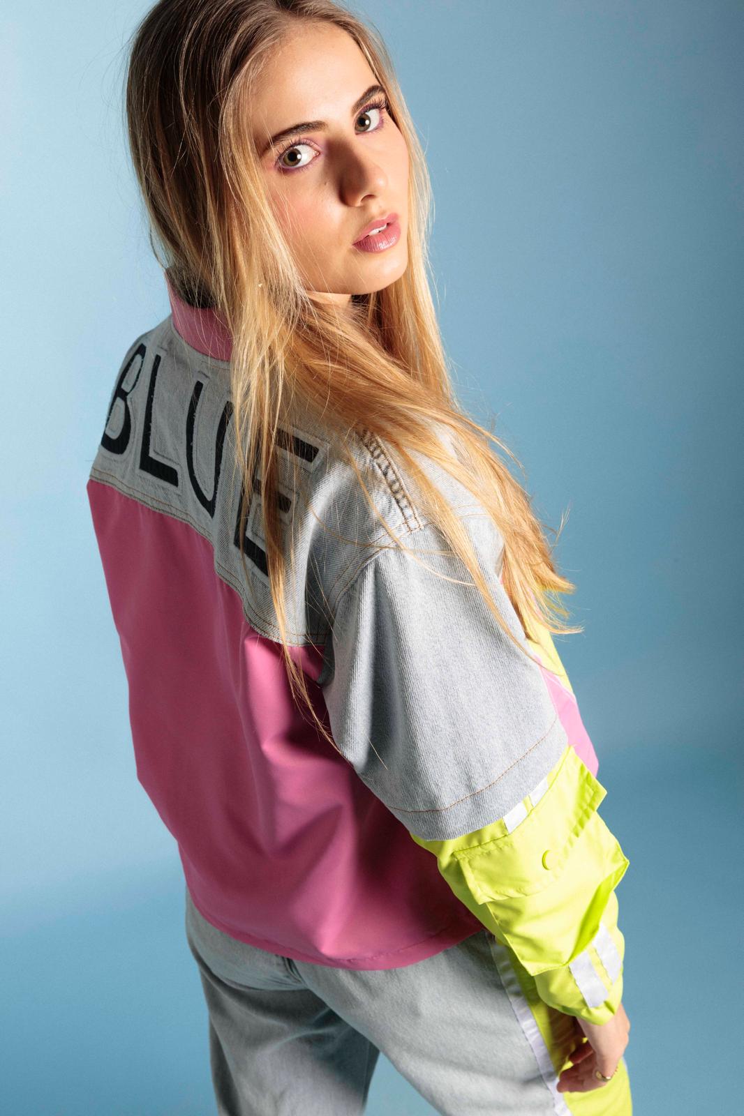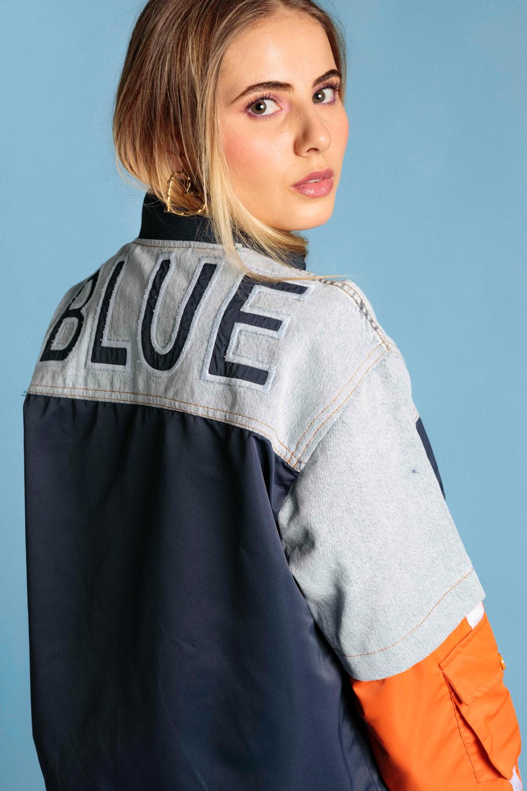 Conjunto composto por blusão de ganga e calças jeans, com aplicações em tecido. Blusão com dois bolsos de lado, gola recta, com fecho.