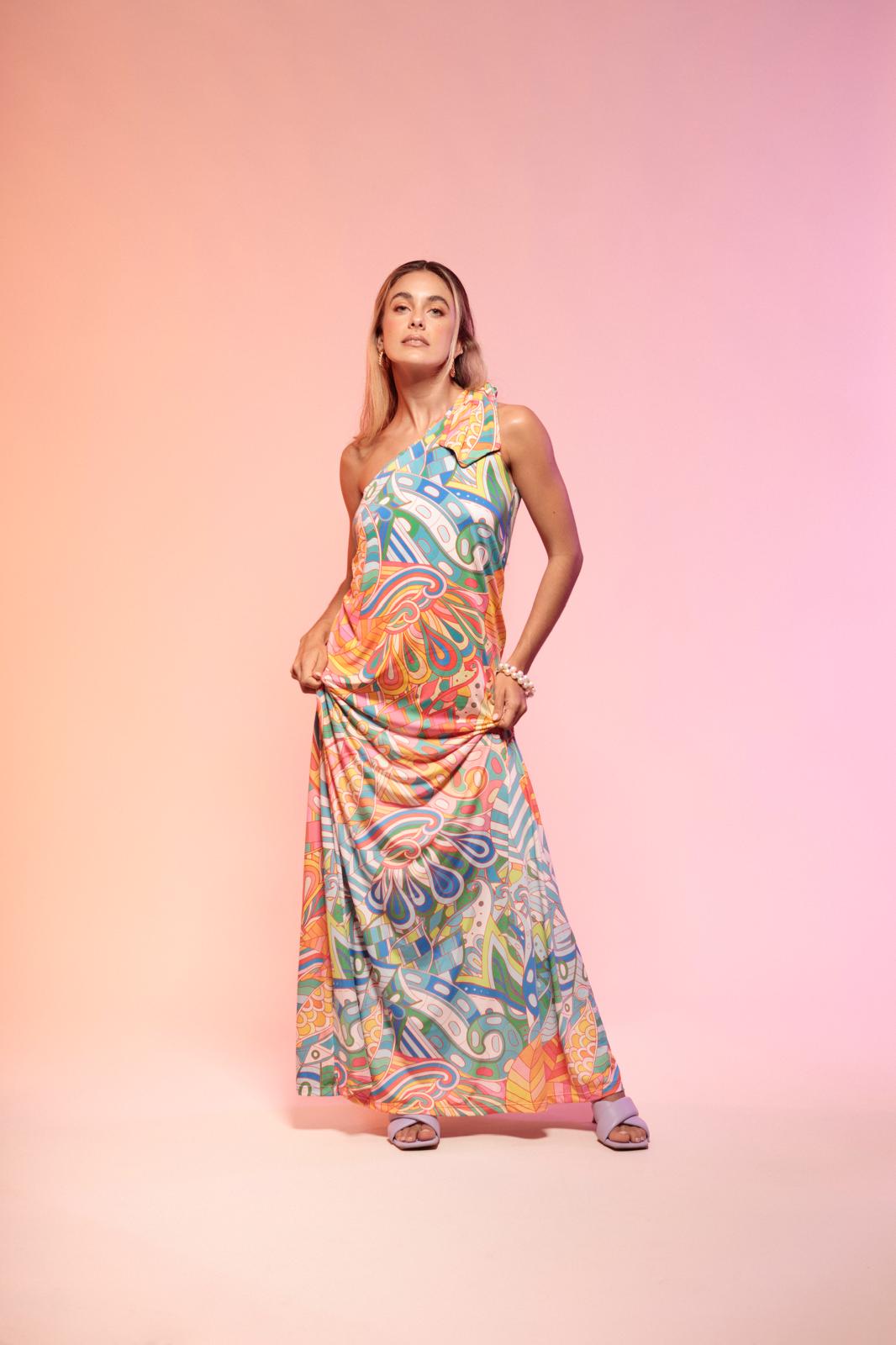 Vestido malha fria, mula manga. Tem um laco que aperta na alça, que pode tambem ser usado como fita na cabeca.  Todo fluido, veste idealmente até um L.